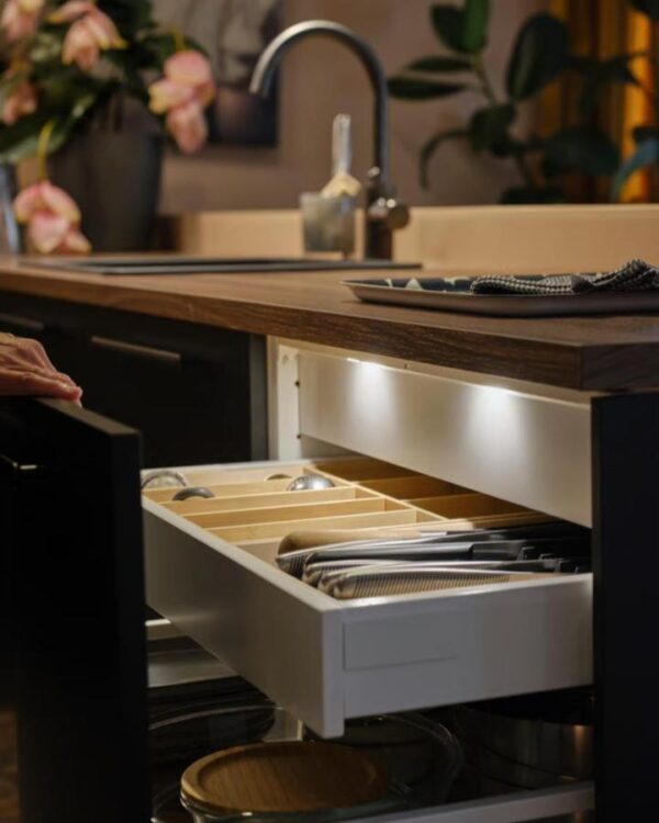 The best IKEA kitchen hacks are often the ones you notice while using the space, and internal drawer lighting is one of them. The warm, practical effect seen in Ikea makes drawers feel more premium while also making utensils easier to find.