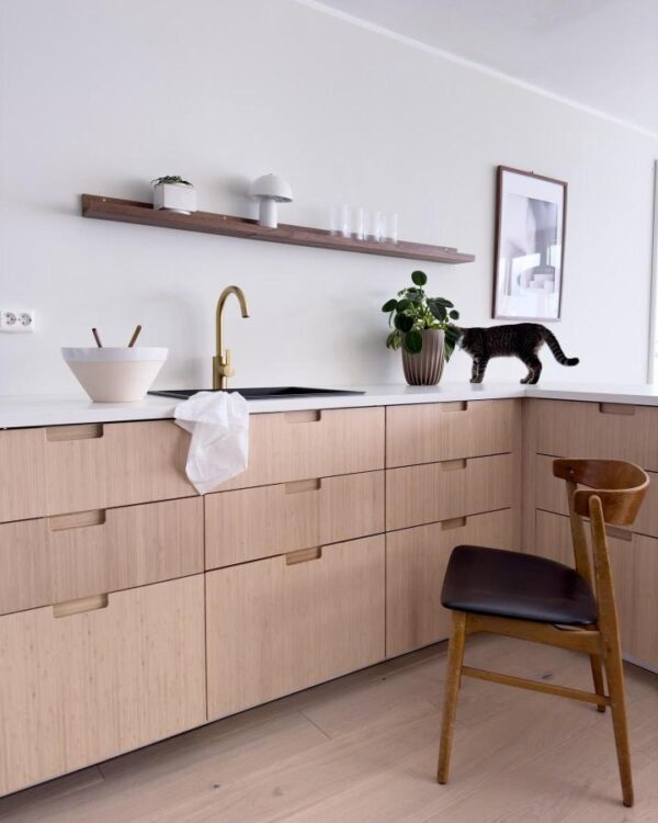 If you want your IKEA kitchen to feel calmer and more contemporary, consider replacing some uppers with a single long shelf, just as @lekkerthjem has done. It keeps the room feeling open while still giving you a place for styling and everyday essentials.