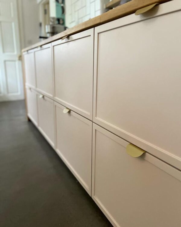 The hardware does a lot of the finishing work here too, and the understated pulls show how effective that can be. Small brass tabs or slim handles are often enough to make standard cabinetry feel polished rather than purely practical.