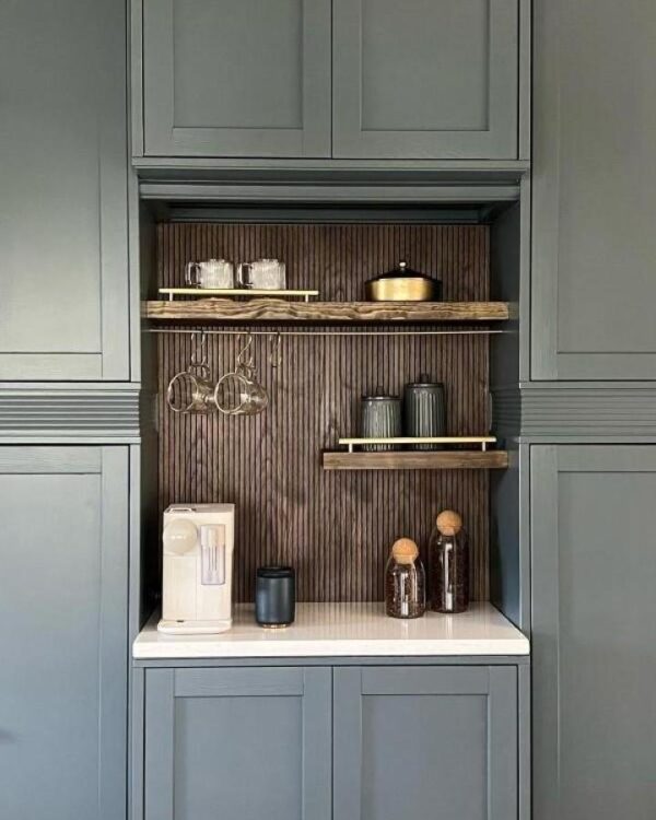 This kind of station feels especially bespoke when you add a contrasting back panel, open shelves and a bit of styling. The niche proves that even a small section of cabinetry can become a real focal point.