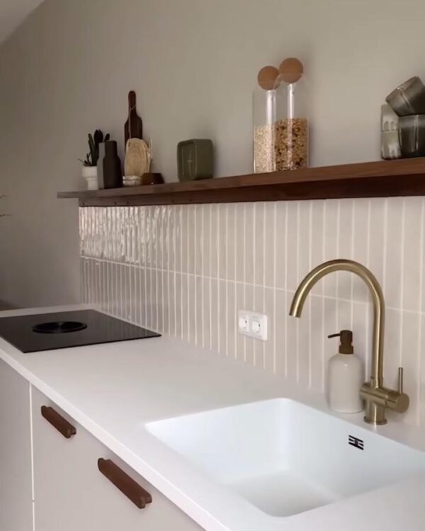 Open storage does not have to mean a whole wall of shelves, and @ldessinehome shows how effective one simple ledge can be. A slim shelf gives you room for oils, ceramics and everyday pieces while keeping the worktop below feeling clear.