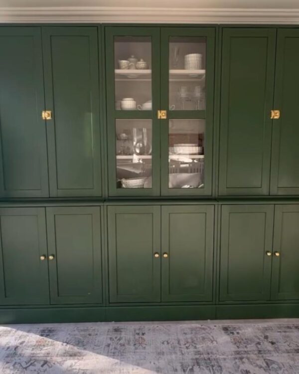 Glass doors, trim and warm hardware help push the look even further. In the kitchen by @maxine.home, the rich paint colour turns a simple storage wall into a standout feature.