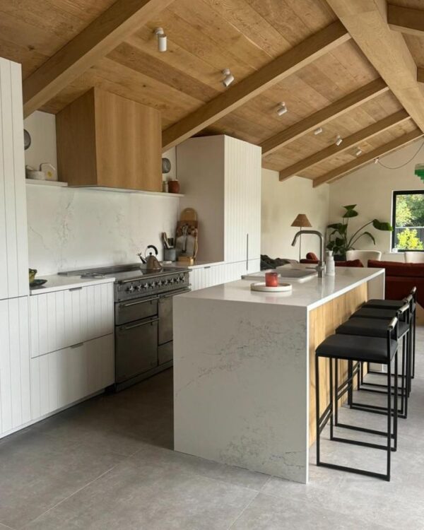 That mix works because the statement details do most of the visual heavy lifting. In the kitchen from @our_bears_home, the waterfall-style worktop and custom-feeling panels instantly elevate the whole room.